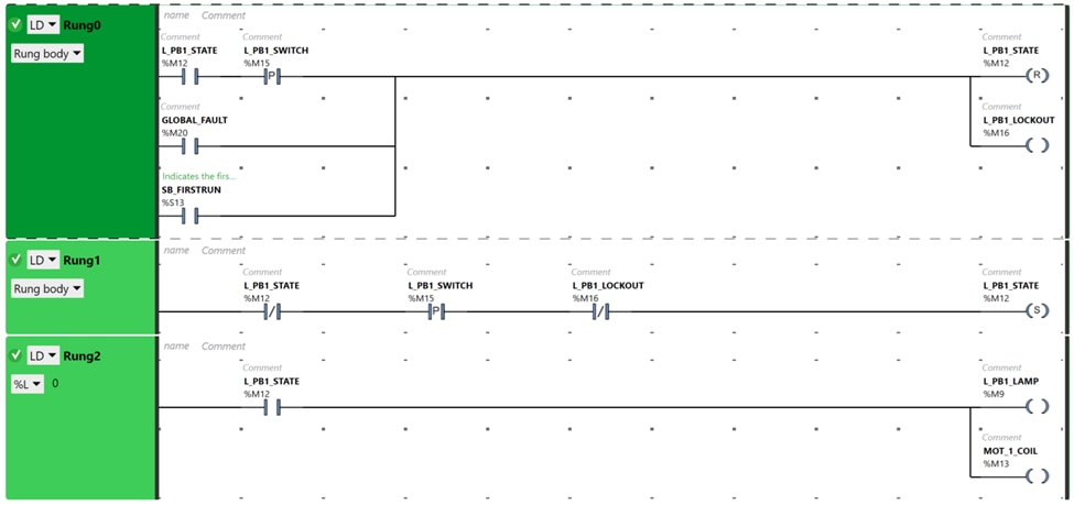 Ladder Diagram, also known as Ladder Logic or Relay logic is a widely used graphical programming language that mimics the original relay logic and wiring diagrams that were used in process control before PLC devices were developed. Great for simple on/off interfaces, logic control, and safety interlocks, LD is still favored in modern PLC programming as it easy to get started with and logically consistent with each rung of the ladder detailing the input and control devices as read from top to bottom and left to right.