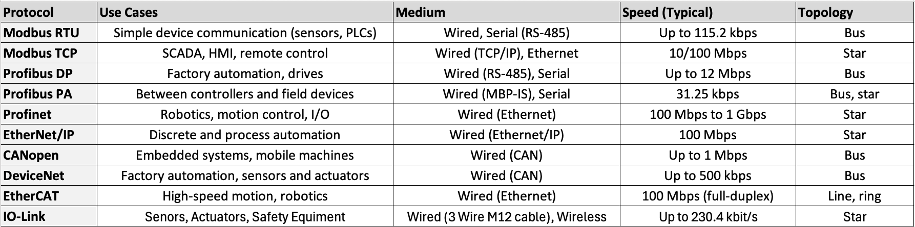 Simple and widely used serial communication standard found in legacy industrial systems. Has limited transmission data rate (maximum of 115.2 kbits per second,) Modbus is popular because of its royalty free implantation and simplicity.