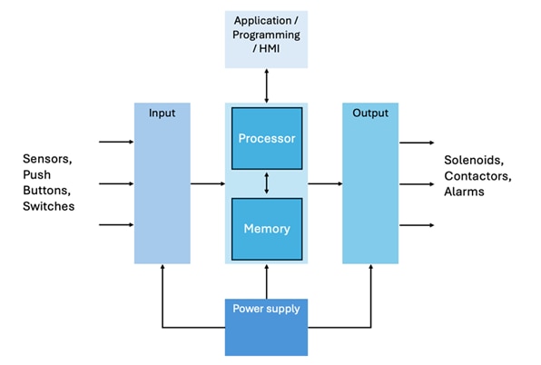 Programmable Logic Controllers (PLCs) are industrial control units that monitor and respond to incoming signals. The signals they receive are based on sensor and process control data. PLCs respond based on algorithms that are programmed in them.