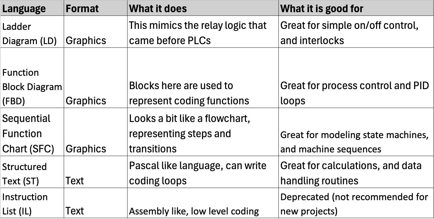 The International Electrotechnical Commission (IEC) standard 61131 section 3 outlines the five different PLC programing languages most common for programming PLC, we'll discuss them below.