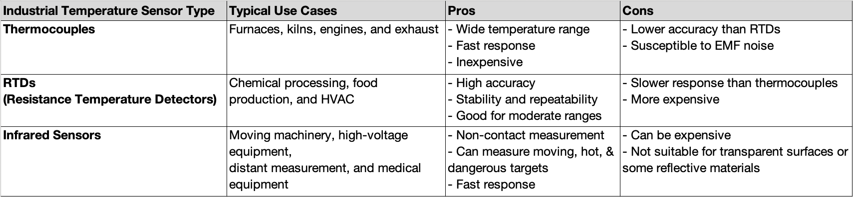 Temperature sensors measure thermal conditions and local temperature in process for control and monitoring and to avoid overheating and thermal runaway conditions. Temperature sensors can either be contact and changing electrical properties or by measuring the infrared energy given off.