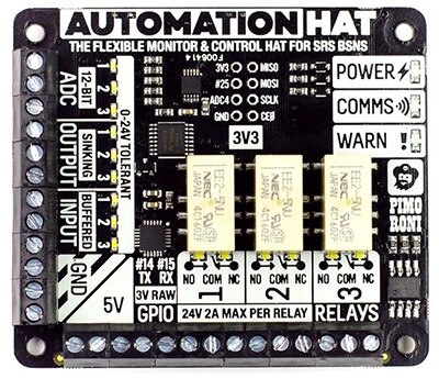 Pimoroni Automation HAT 專為自動化系統之監測與控制所設計,結合多個 I/O 通道,包括類比和數位輸入、帶電輸出及繼電器控制。I/O 通道除了支援 24 V 電壓外,還提供相當大的輸入和輸出緩衝。例如,繼電器輸出可支持高達 2 A 的電流,足以驅動 Crouzet 81 546 001 螺線管閥之類的低功率 24 V 零件。