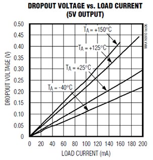 圖 6:對於 LDO 裝置,安全工作區的最大可允許輸出電流,以及輸入輸出電壓差幅度之間呈現反逆關係;此外,封裝類型也是重大因素,從標準 SO-8 及專用型 8 針腳 µMAX 封裝之間的差異便能看出。(圖片來源:Maxim Integrated)