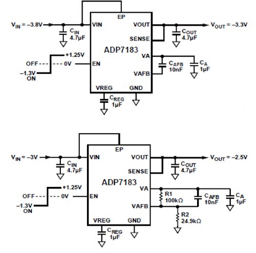 圖 3:Analog Devices 的 ADP7183 系列適合負電源/負輸出應用,且也經常實際運用;這些裝置可設定為固定輸出 (如上方線路圖所示的 -3.3 V),或可由使用者調整的輸出 (如下方線路圖所示,設定為 -2.5 V)。(圖片來源:Analog Devices)