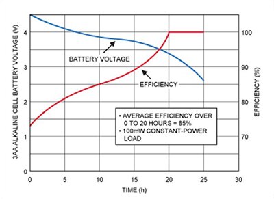 雖然完全充滿電的電池效率大約為 73%,但整個放電週期中的平均效率則是 85%。應使用此數值來跟切換式穩壓器的效率進行比較,且切換式穩壓器的效率不會隨著電池電壓下降而提升。
