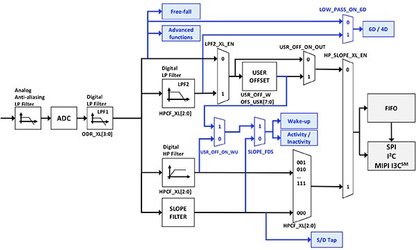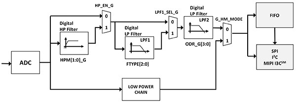 與許多進階感測器一樣,LSM6DSOX 架構採用多階段訊號鏈,將類比數位轉換器 (ADC) 與多個濾波階段相整合。該陀螺儀訊號鏈以一系列可選數位濾波器補充 ADC 階段,包括高通濾波器 (HPF)、低通濾波器 (LPF1) 以及第二低通濾波器 (LPF2)。這些濾波器在裝置的高效能模式下工作,但是在正常模式或低功率模式下則被略過 (圖 1)。