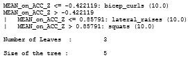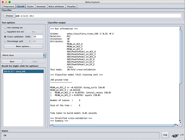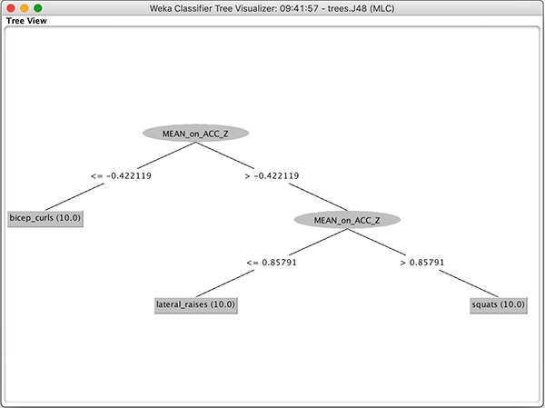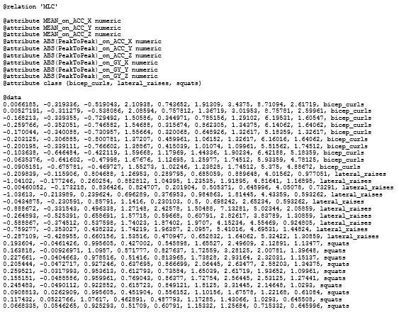 在 Unico 中細化資料和決策樹配置之後,開發人員會使用該工具將選取的特性組轉換成標準格式,亦即屬性關係檔案格式 (arff)。arff 檔案包括標題部份,會列出選取的屬性 (特性) 與可能的類別,還包括資料部份,會列出每一組的收集資料以及相關的類別 (清單 1)。本範例僅使用極少的特性,且僅用一小組的資料實例組來識別有限的類別組,包括二頭肌彎曲、側面平舉及深蹲。