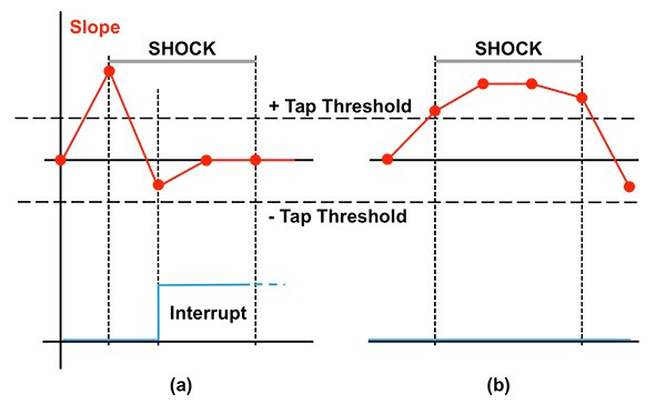 相對於更廣泛的衝擊事件,單擊事件的斜率會在超過某個閾值後迅速下降 (圖 3)。使用開發人員設定的單擊閾值,以及衝擊窗口持續時間,裝置可以自動偵測單擊事件,並向主機微控制器發出中斷。
