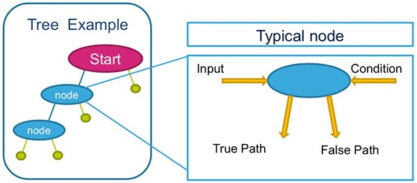 決策樹已在決策支援系統中使用多年,可比對預先定義的條件,測試輸入資料 (即屬性),將複雜的決策往下細分為一系列的選項。從初始節點 (亦即「根」) 開始,測試屬性的值,然後由結果來決定是否繼續前往特定的子節點 (圖 4)。