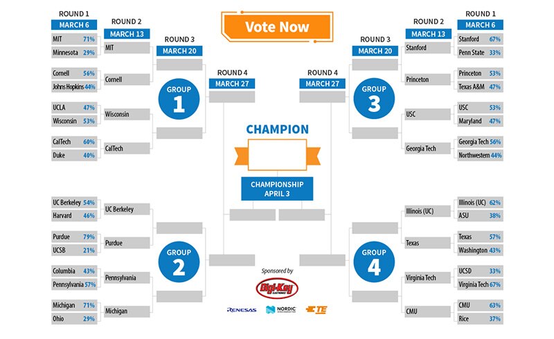 春天翩然而至!秉承「瘋狂三月」(March Madness) 的精神,我們很高興攜手 Renesas Electronics、Nordic Semiconductor 和 TE Connectivity,一同支持 Electronic Design 舉辦的第 4 屆年度大學晉級預測挑戰賽 (Annual University Bracket Challenge)!Electronic Design 的編輯團隊,挑選出美國 32 所擁有強大工程社群的大學參賽。