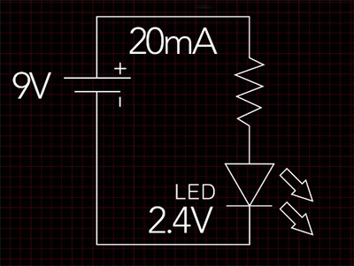 如果您還不熟悉歐姆定律,請讓我現在介紹一下。歐姆定律定義了電壓、電流和電阻之間的關係,方程式為 V = I * R。如果您知道其中任兩個元素,則可重新組織這個方程式,找出所缺的元素。在下面這個例子中,我們首先來看看電壓為 9 V、電阻值未知,LED 的順向電壓為 2.4 V,額定電流為 20 mA 的情形。