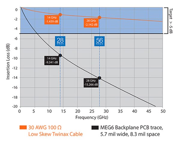 圖 3:Samtec 的低偏斜、低損耗纜線與背板式 PC 板走線設計的對比中顯示,Twinax Flyover 纜線在 28 GHz 下的插入損耗低大約 13 dB。(圖片來源:Samtec Inc.)
