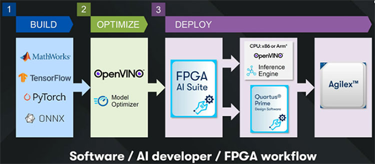 The Agilex™ 5 platform integrates seamlessly with leading AI frameworks (Figure 2), simplifying the development of custom AI inference solutions. It supports TensorFlow, PyTorch, and the OpenVINO™ toolkit, which optimizes deep learning models for FPGA inference using Altera’s FPGA AI Suite and Quartus® Prime design software.