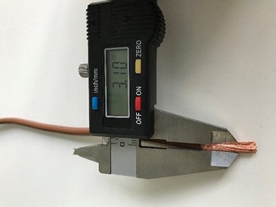 我使用這種方式測量一條已知直徑的纜線,測得的直徑是 3.1 mm。計算之後,截面積是 7.5 mm²。在歐洲,纜線須依照特定截面積規格製造,例如 4 mm²、6 mm²、10 mm² 以及 16 mm²。當然,也會製造較粗及較細的纜線,但通常沒有介於規格值之間的尺寸。接近測量值的兩個規格值是 6 mm² 或 10 mm²。6 mm² 的纜線直徑應為 2.8 mm,而 10 mm² 的纜線直徑應為 3.6 mm。我在測量時絕對不會把線股壓縮到 0.5 mm,反而是壓得不夠緊,所以 6 mm² 的截面積是比較接近的數值,而且也符合我所知的截面積值。