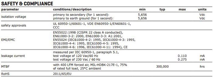 Another factor that needs to be discussed is reliability. The engineer who is tasked with creating a discrete power supply can test this to a small degree. They will ultimately be able to test a few of their products at a cost to see how well the product performs in different environments. CUI can also do such testing, but will specialize in this kind of testing. New products will not have much reliable long-term reliability data until they have been in the market for some time. Power modules will have more reliable data to draw from to understand how they are going to perform in a given environment. On the VMS-365 series datasheet there is a section in the “Safety & Compliance” table for MTBF. MTBF stands for “Mean Time Between Failures.” This will give the engineer a time frame for how long the module should last. Figure 4 shows the MTBF rating.