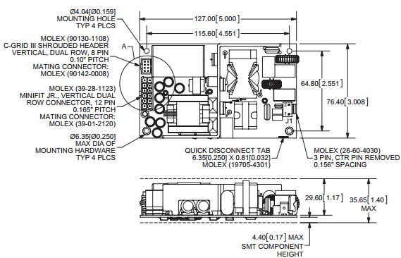 This device comes with UL 60950-1/60601-1, VDE EN60950-1/EN60601-1, CCC safety approvals. Along with the approvals, the device is RoHS compliant. The device is also optimized for space, boasting a power density of 18 W/in3, meaning every cubic inch can produce 18 watts of power. This is a chassis mount power supply so it will not have to compete with what is laid out on the board, allowing the design engineer to use more real estate on their board for critical design features. The open frame supplies for the VMS-365 series measure 5.00" x 7.00" x 1.17". Figure 2 illustrates the physical dimensions of this module.