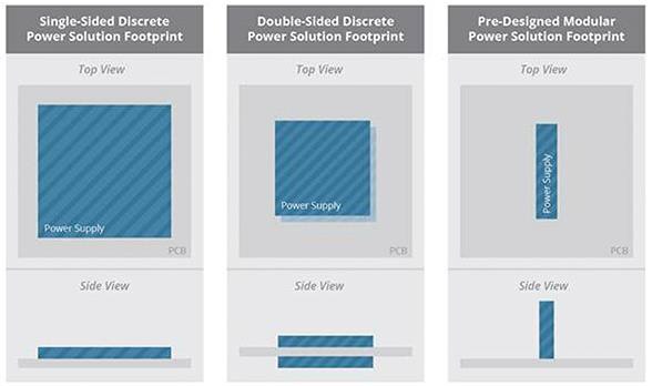 Since these power supplies are modules, they can be mounted vertically. Discrete power supplies will inherently take up board space and could end up taking space on both sides of the board. By adding a vertical board on the Z-axis, minimal amounts of space will be taken up with maximum power yield. Figure 3 demonstrates this point.