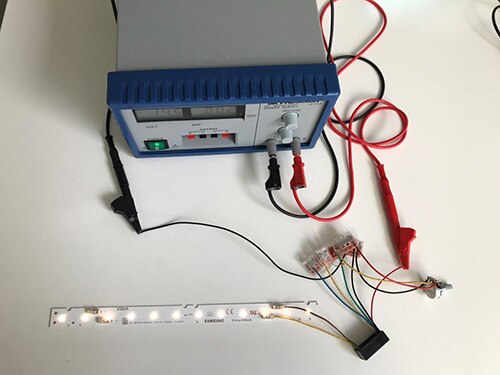 第二次,我將 LED 驅動器和 LED 模組相連、將 LED 驅動器未使用的纜線端進行絕緣,然後再次用電源供應器的 10 V 至 15.5 V 電壓進行測試。結果完全符合我的預期。從我主觀的角度來看,LED 在整個輸入電壓範圍內都維持固定的亮度。
