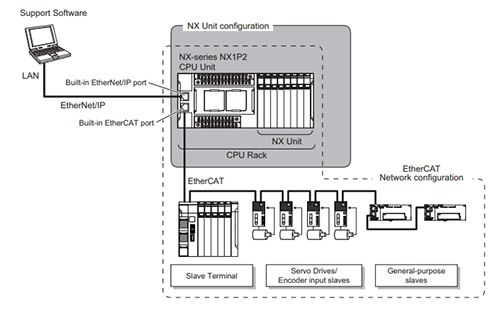 典型系統包含了透過乙太網路/IP 連接 LAN 以提供網路存取的 NX1P2 CPU 裝置、用於動作控制的 EtherCAT,以及數個 NX 擴充裝置,可滿足各種 I/O 和電力要求。