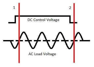 零交叉 (同步):施加控制電壓後,繼電器要等到負載電壓超過零時才會啟動。下圖中,DC 控制電壓發送至輸入端,但 AC 負載電壓一直到行 1 (正弦波首次超過零) 時才導通到輸出。控制電壓關閉之後,且正弦波首次超過零時,負載才會再次關閉 (行 1 指出啟動點,行 2 則指出關閉點)。