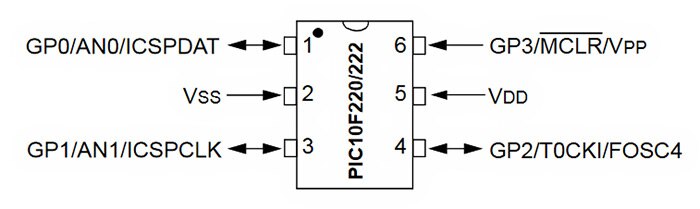 Microchip 的 PIC 系列長久以來一直是低成本嵌入式系統開發人員的首選。該公司的 PIC10F220 微控制器具有 256 字組的指令快閃記憶體 (每個指令字組為 12 位元寬),以及 16 位元組 RAM。此微控制器具有一組簡單的指令集,只需學習 33 種指令,而且除了分支指令之外,其餘指令都可在一個週期內執行完畢。分支指令需要兩個週期。在 8 MHz 內部時脈下,指令週期為 500 奈秒。此為 6 針腳元件,因此會在元件的四個 I/O 針腳上進行周邊裝置的多工處理。PIC10F220T-E/OT 包含以下周邊裝置: