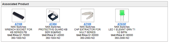 在挑選合適的開關時,還要注意此開關所能使用的配件,以及這些配件在您的開關設計應用中是否為必要或有用的。Digi-Key 的網站在這方面非常有幫助。查看指定開關的產品頁面時,所有適用的配件都會列在頁面的底部。以 NKK Switches 的 KB16CKW01-5F-JF 為例,這款開關有四款配件,皆列在「相關產品」區塊中 (圖 2)。