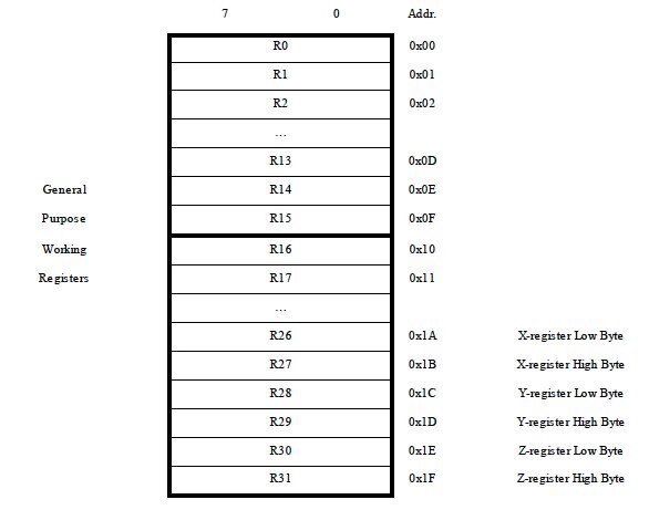 GP 暫存器可組合成暫存器對,形成十六個 16 位元暫存器。最後三個暫存器對可選擇作為 16 位元位址暫存器 X、Y 與 Z 使用,實現間接的定址。