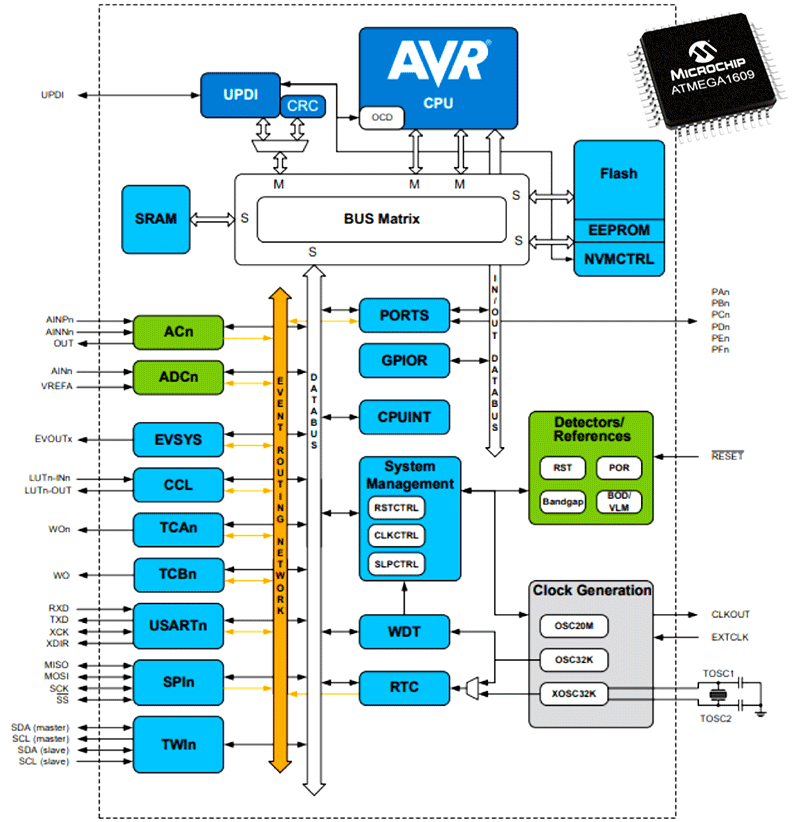 ATMEGA1609 所需的電源供應器頗具彈性,電壓介於 1.8 至 5.5 V 之間,工作溫度範圍為 -40°C 至 +125°C。寬廣的電源電壓及工作溫度範圍並非偶然。從設計角度來看,這款 8 位元微控制器旨在適應以及用於多種設計環境。「易用性」是其重點!