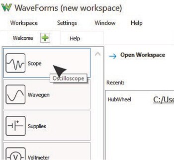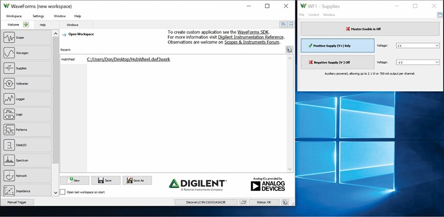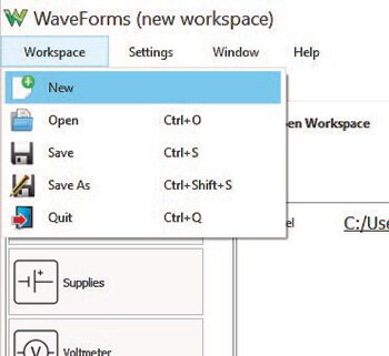 WaveForms 是實作 AD2 必須使用的軟體,可從網路上下載。下載並安裝後,選擇 Workspace (工作區) 下拉式清單,然後從清單中選擇 New (新增)。隨後會開啟新的工作區,即可進行設定 (圖 3)。