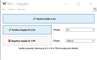 從正電源 (V+) 的 Voltage (電壓) 下拉式清單選擇器中選擇 5 V,對電源進行設定。透過按鈕切換確保負電源 (V-) 為 Off (關)。此按鈕應標明為「Off 」(關),並顯示紅色「X」圖形。將 Master Enable (主啟用) 切換至「On」(開) 來啟用輸出 (圖 6)。