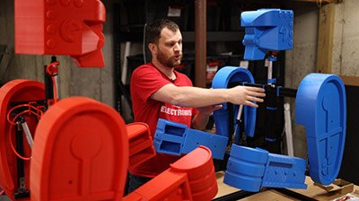 With the underlying frame functioning, the focus shifts to how to make it wearable. In the game, the armor takes about five seconds to put on or take off, and ideally, we can get close to that in real life. This requirement imposes a challenge - you can hardly tie your shoelaces in five seconds, let alone secure buckles on every limb and snap shut a series of armored plates! Bogdan took this problem on by making each limb a pneumatically articulated clamshell with an inflatable liner and an automatic latch. With all the pneumatic actuators controlled in a tight sequence by the PLC, the wearer can step in through the back - which raises out of the way when the suit is unoccupied - and step into place before the limbs latch shut and inflate to comfortably nestle around the wearer.