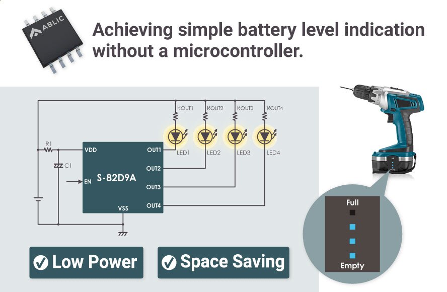ABLIC S-82D9/82F9 系列電池監測 IC 可以點亮四個或五個 LED 並監測電壓,提供簡單的燈號來顯示剩餘的電池電量。將多個電壓監測功能整合到單一顆 IC 中有助於節省系統中的空間。此外,無需微控制器即可運行,降低電池電壓監測的功耗。