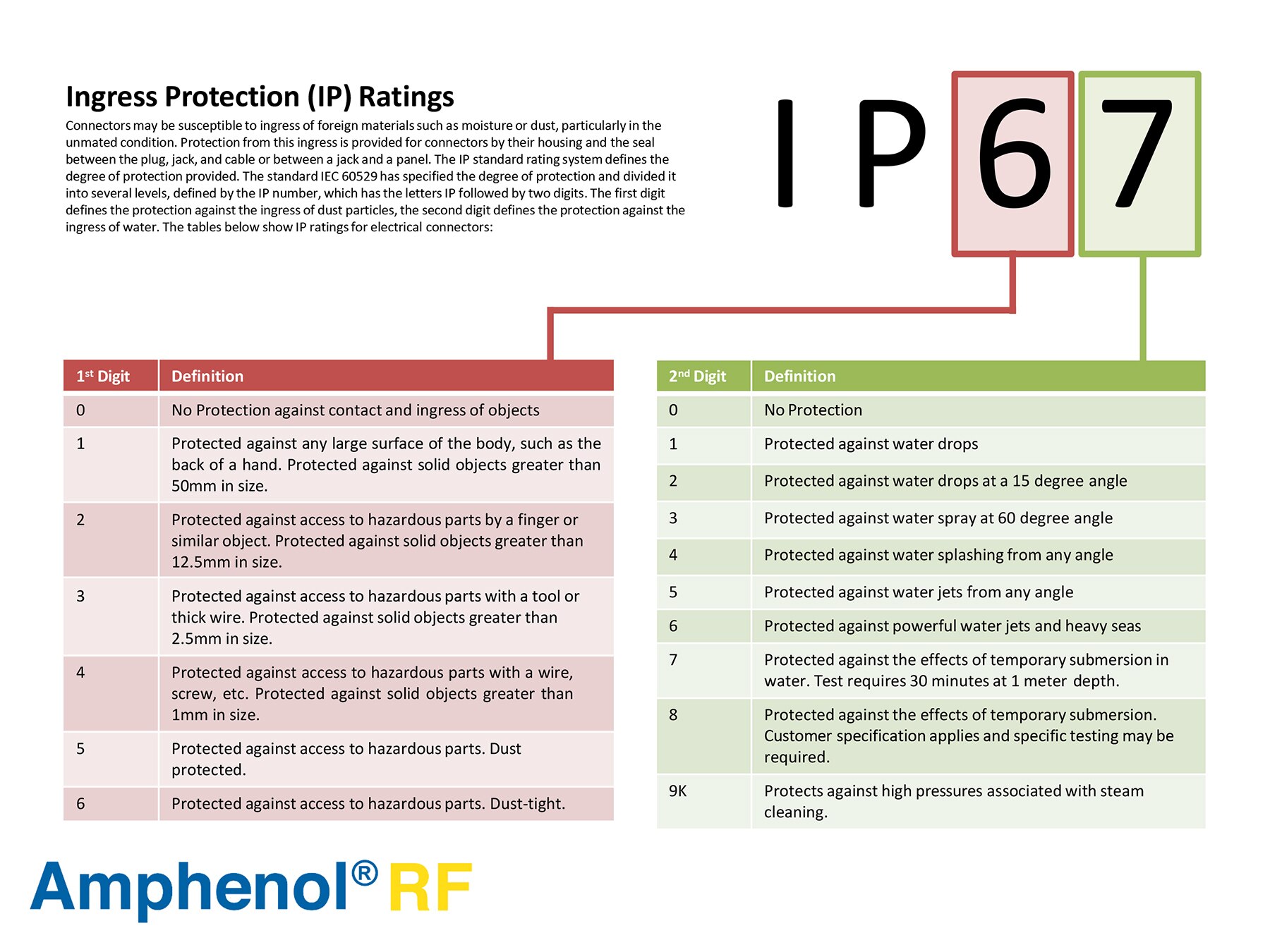 Amphenol RF offers a wide range of IP67 interconnect RF solutions for your rugged applications. Ingress Protection ratings are used to specify the environmental protection of enclosures and casings around electronic products. The first number that follows IP defines the protection against the ingress of dust particles; the second digit defines the protection against the ingress of water. Products designated with an IP67 rating means that they are dust-tight and protected against the effects of temporary water submersion.
