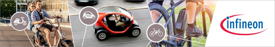 Infineon is specialized in offering complete system solutions encompassing all fundamentals, namely power electronics, controllers, security, and authentication. And of course our advanced sensor technologies add value, too. With our pioneering spirit sustained by technical know-how, highest quality standards and preeminent manufacturing expertise throughout the entire supply chain, we strive to be benchmark in addressing a broad range of light electrical vehicles. With our portfolio we already cater for e-skateboards, e-scooters, pedal electric cycles (i.e. pedelecs), low speed electric cars, e-forklifts, e-rickshaws, three-wheelers in general and many others. Multiple functional blocks are thereby considered (e.g. motor control, battery chargers, air conditioning systems, hydraulic control). Power management and consumption as well as voltage regulation are covered by an exceptional selection of power components (high voltage CoolMOS™, low voltage OptiMOS™, StrongIRFET™, SiC and GaN based products), XMC™ and AURIX™ microcontrollers, and EiceDRIVER™ gate driver ICs – amongst others. In other words, Infineon offers all components that are needed for the compact, cost-effective designs of today, and for the innovative vehicles of tomorrow.