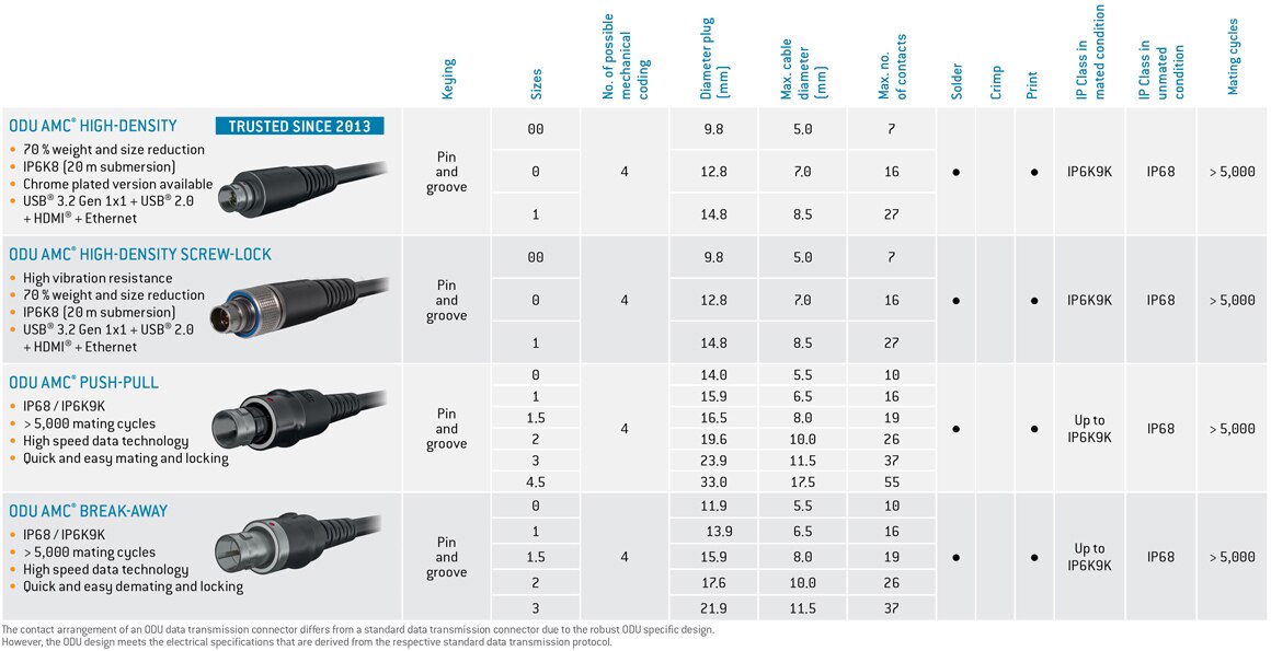 1 ODU 數據傳輸連接器的觸點排列與標準數據傳輸連接器的不同之處,在於其穩健的 ODU 專屬設計。不過,ODU 設計仍符合各項標準數據傳輸通訊協定所衍生的電氣規範。
