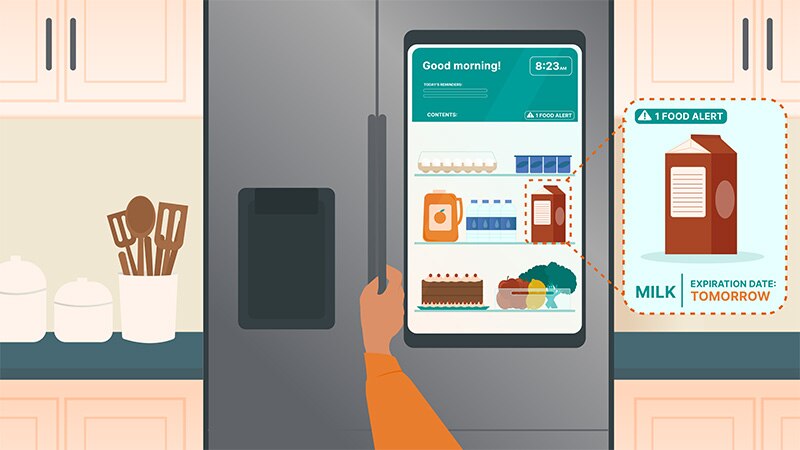 智慧冰箱中的 onsemi 感測器顯示牛奶即將過期。早餐就吃麥片吧!