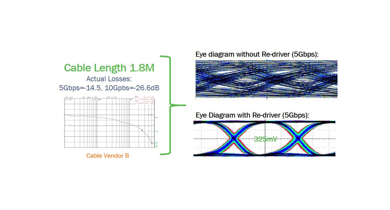 以 5 Gbps、10 Gbps 等高速數據傳輸率進行傳輸時,FR4 和連接線的作用類似於低通濾波器,會衰減 (損失) 資料串流的訊號完整性或「眼圖」,直到接收器開始丟棄位元,導致高位元錯誤率。轉接驅動器提供等化增益來補償這種衰減或損失。