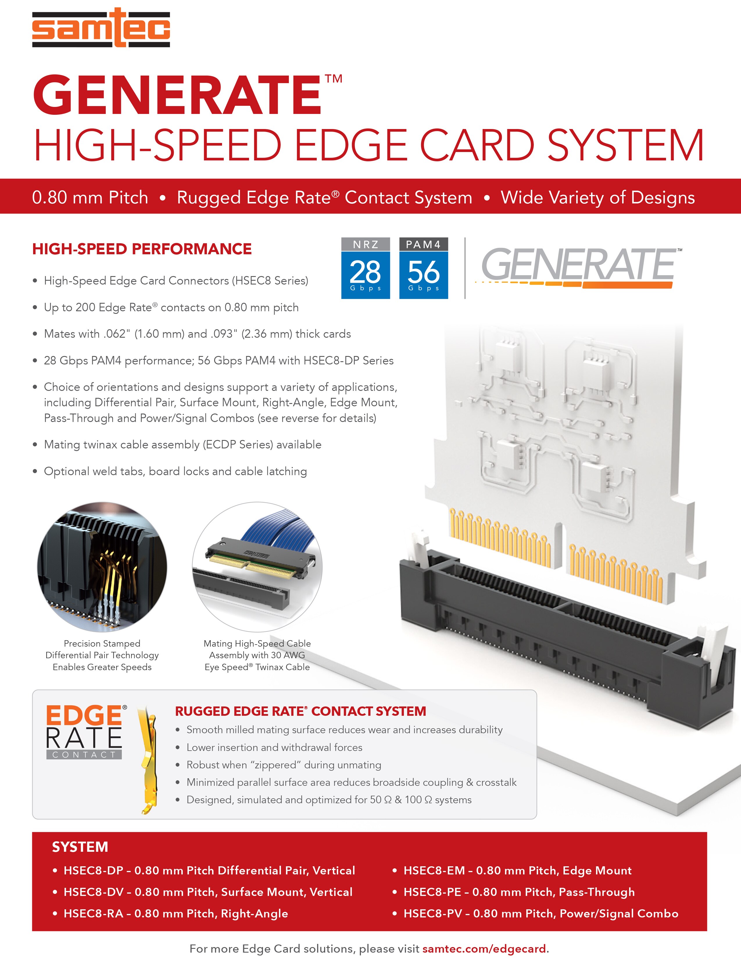 High-speed edge card interconnects on choice of 0.50 mm, 0.80 mm or 1.00 mm pitch and a variety of options.