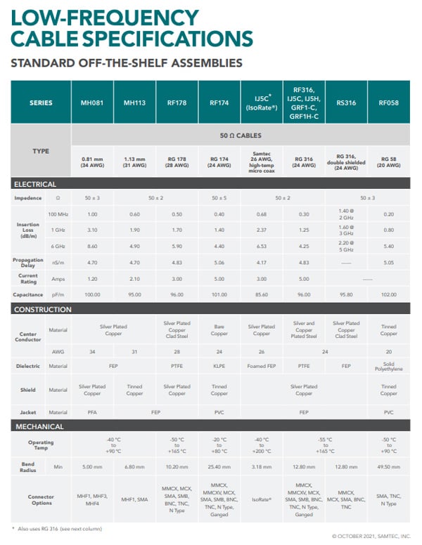 Samtec 適合 50、75 Ω 應用的低頻 RF 纜線和互連元件