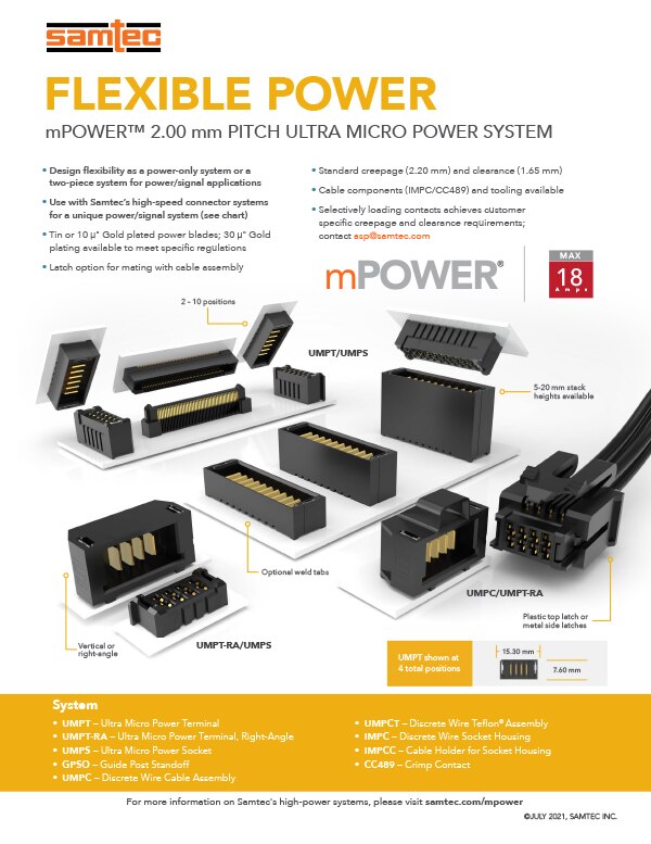 mPOWER™® 連接器系統是終極的微型、高功率解決方案,具有絕佳的設計彈性,適用於僅有電源或電源/訊號應用。由於具備多種堆疊高度,mPOWER® 可以輕鬆添加至新的或既有的架構中,搭配 Samtec 的高速連接器系統,達到獨特的兩件式電源和訊號/接地解決方案。