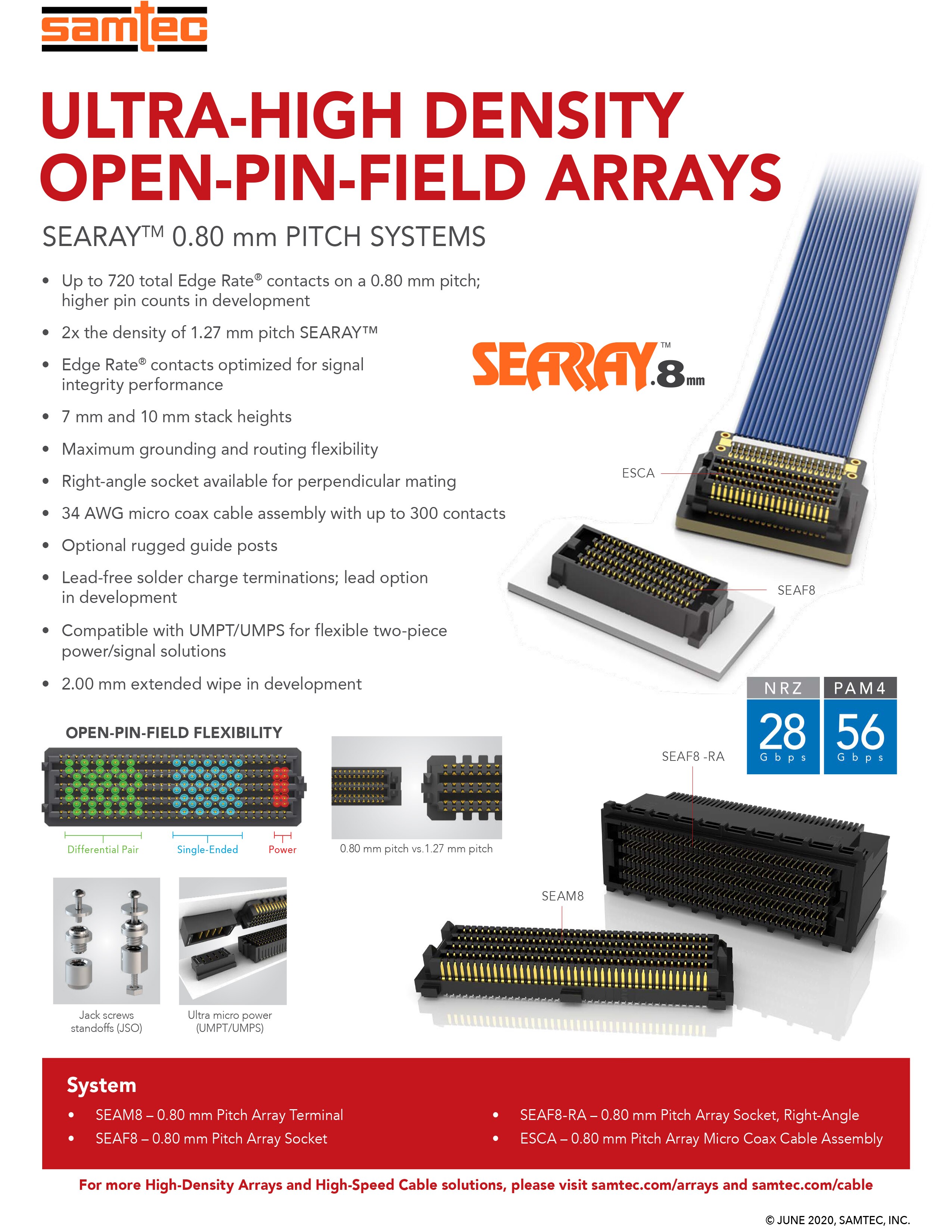 Samtec 的 SEARAY™ 產品提供業界最豐富的高速、高密度、開放式引腳區陣列品項。SEARAY™ 具有多達 720 個 I/O,能為單端或差動對配置、電源、訊號或接地提供最大的設計靈活性。它們支援高達 56 Gbps PAM 4 應用,並提供 0.80 mm、1.27 mm 間距,堆疊高度為 7 mm 至 40 mm。亦提供高速配接纜線。