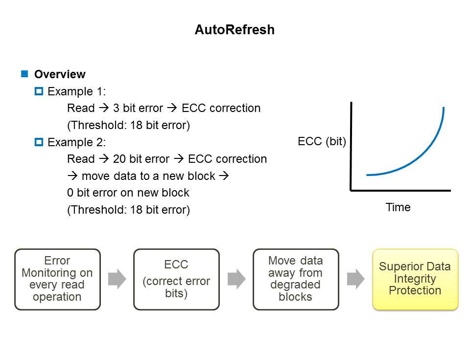 Read disturbance causes data corruption due to accumulated read cycles on the same page without a rewrite or erase of those cells. Over time, uncorrectable ECC errors may occur resulting in data loss. This error is very common in read-only applications without regular wear-leveled write operations. In order to circumvent this error, the NAND Flash product controller must utilize read disturb detection and avoidance technologies which automatically refresh the NAND before data corruption occurs. ATP’s AutoRefresh feature helps to nullify these read disturbance concerns. With ATP AutoRefresh, the controller automatically refreshes a portion of data blocks during power on. Furthermore, a percentage of write operations can be implemented into the host device usage model for additional risk aversion.