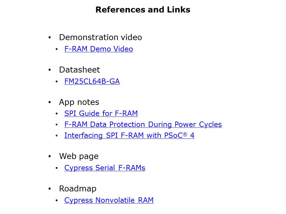 References and links to app-notes, the data sheet, a demonstration video and roadmaps for Cypress serial F-RAM can be found on the Cypress web page.