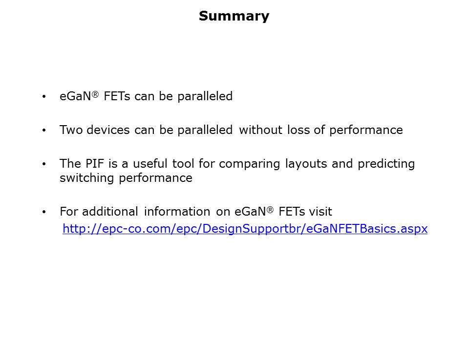 In summary, eGaN® FETs can be used in parallel without loss of their switching characteristics. A formal analysis was conducted on a variety of layout configurations and topologies and the results were quantified through the use of a new metric, the Parallel Impact Figure, or PIF. The PIF can be used to compare layouts and predict circuit performance when more than one eGaN FET is used for each switch. For more information please see the eGaN design support site on the EPC website.