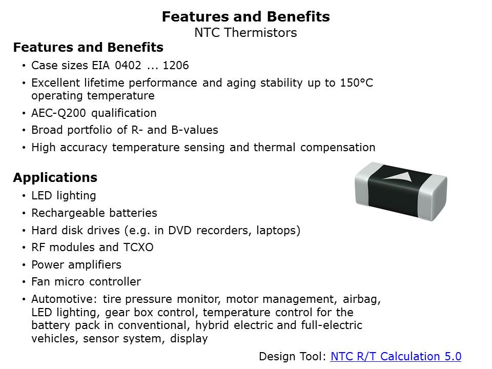 NTC (Negative Temperature Coefficient) thermistors are thermally sensitive semiconductor resistors which show a decrease in resistance as temperature increases. EPCOS brand NTC thermistors are simple, but very sensitive and accurate sensing elements for measuring and control temperature in circuits.
