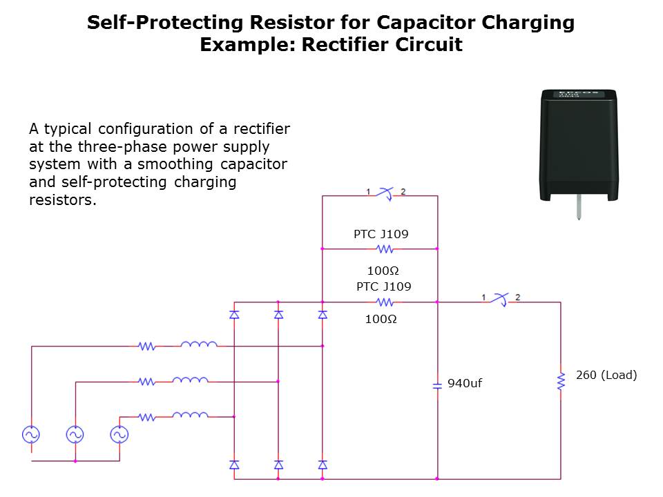 A typical application is shown in this slide with a three-phase bridge rectifier connected to a power supply with a phase-conductor voltage of 400 Vrms. The smoothing capacitor used has a capacitance of 940μF. A parallel circuit consisting of two J109 type charging resistors is used to limit the inrush current. Each charging resistor has a rated resistance of 100Ω at an ambient temperature of 25˚C. The parallel connection of two components is required in this case because of the large amount of energy that must be transferred to the capacitor during charging. A single J109 resistor would heat up to an undesirable extent and become highly resistive. This should be avoided, as the link-circuit capacitor would not be allowed to completely charged.