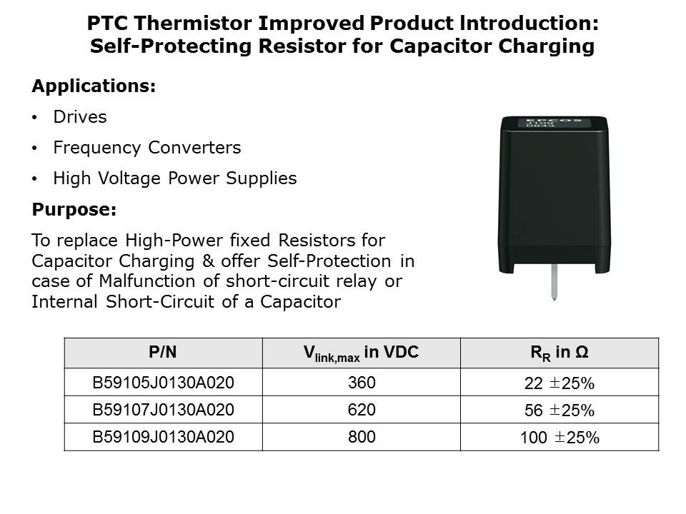 The improved J10X series of charging resistors, based on PTC Ceramic technology, results in a professional solution that is self-protecting despite its relatively compact size. The J10X product family is available in three types, which are listed on this slide.