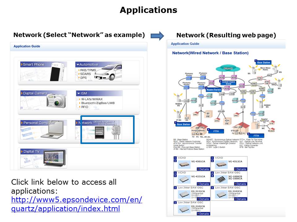 On Epson’s website, the designer may find the recommended SAW oscillator categorized by the various features and functions of the associated application. Shown here is an example for the Network application.