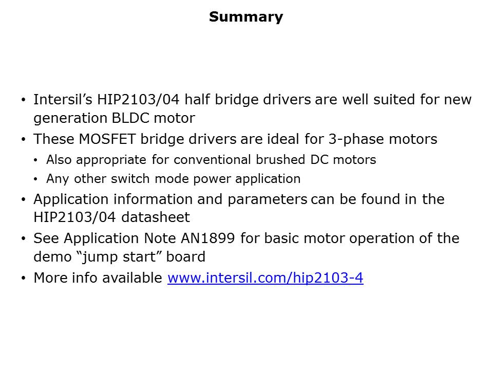 In summary, Renesas' HIP2103 and HIP2104 are half bridge drivers designed for applications using DC motors, 3-phase brushless DC motors, or other similar loads. Application information and parameters can be found in the HIP2103/04 datasheet and application note AN1899. More information on both drivers can be found on Renesas' website at https://www.renesas.com/us/en.