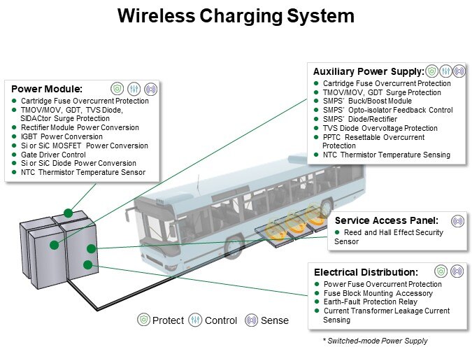 Wireless charging is an emerging application with distinct needs. The power module needs circuit protection devices, power rectifiers, gate drivers, power converters, and temperature sensors. There are similar requirements for the auxiliary power supply. Security sensors may be needed in the service access panel. Fuses and ground fault relays are needed in the electrical distribution.